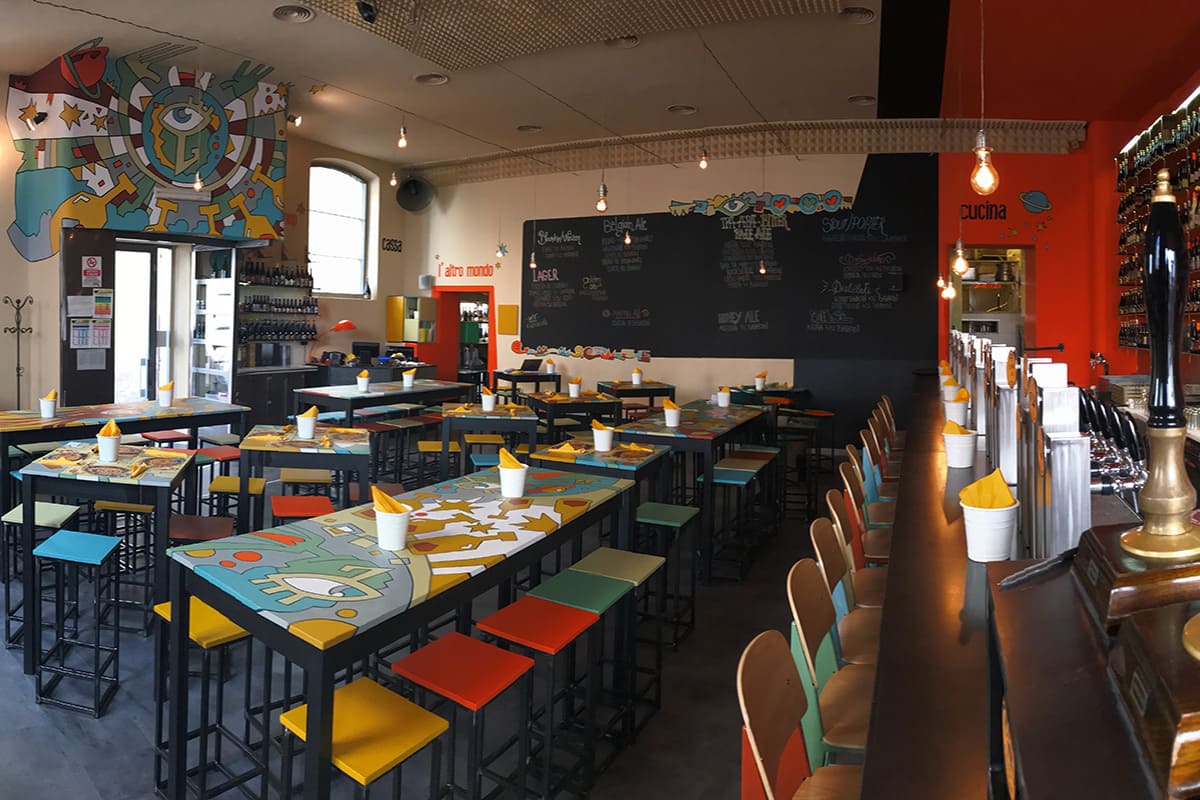 As soon as you step inside, you’re welcomed by a long counter dominated by an impressive wall decorated with hundreds of beer bottles. The deep red walls and the warm ivory tones of the tables create a convivial, inviting atmosphere, while the unmistakable “Bailone style” décor tells the unique story and personality of Baladin.