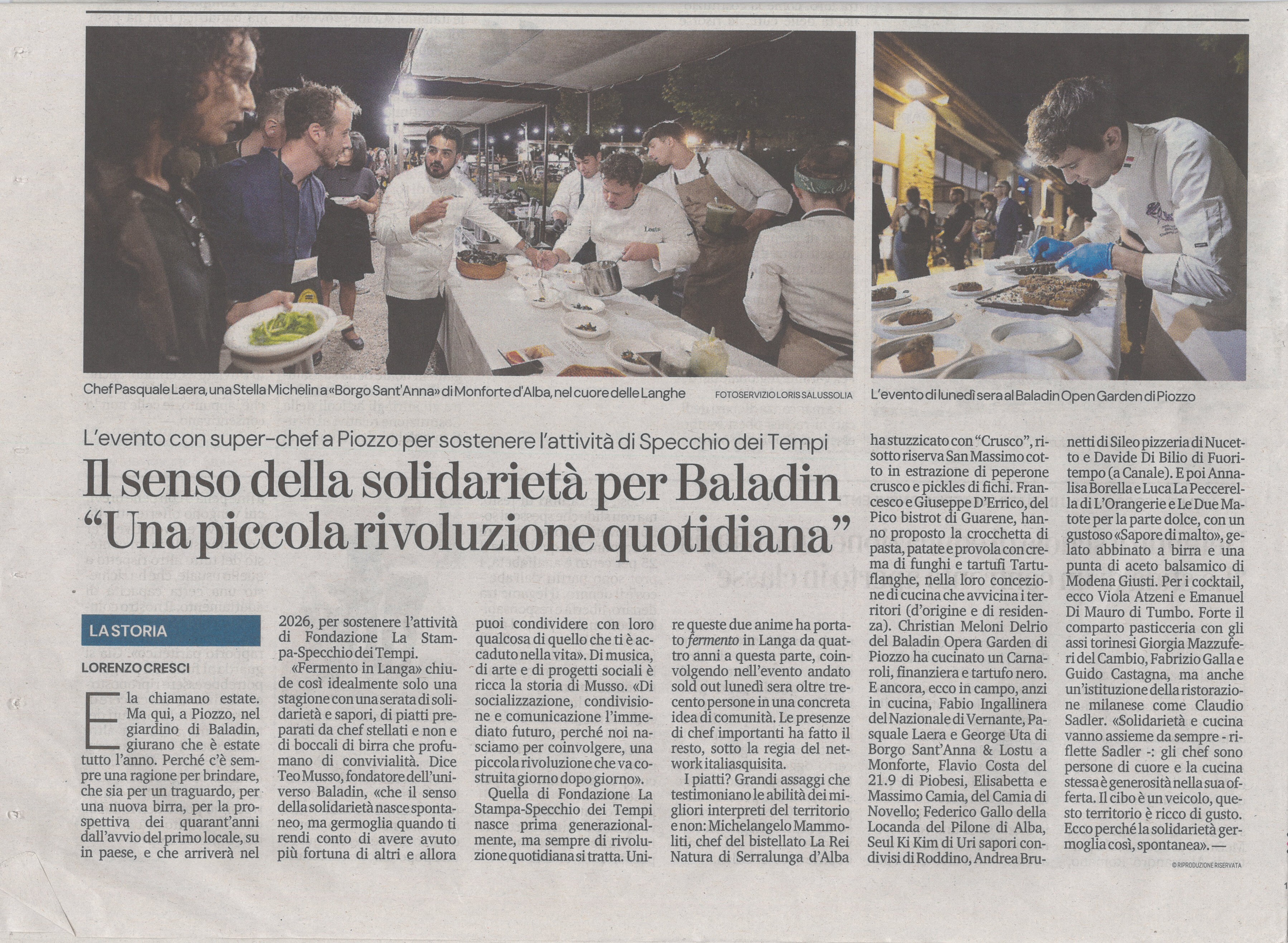 L'evento con super-chef a Piozzo per sostenere l'attività di Specchio dei Tempi. Fermento in Langa si conferma tra gli eventi più attesi in Langa e nel Baladin Open Garden, firmato Italia Squisita e Baladin, ogni anno raccoglie fondi per la Fondazione Specchio dei Tempi e diffonde cultura gastronomica.